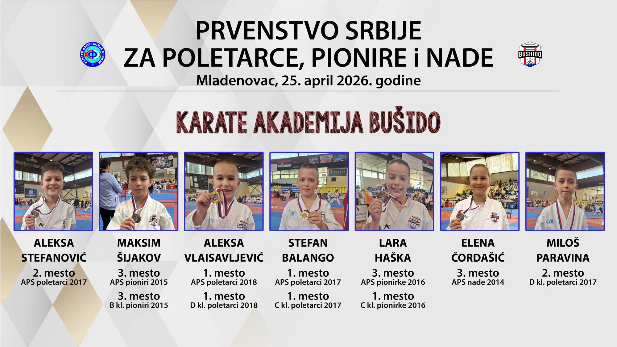 Naši takmičari učestvuju na svim nivoima takmičenja u organizaciji Karate federacije Srbije (KFS) i Karate saveza Vojvodine (KSV). Zahvaljujući dobrim rezultatima koje ostvaruju na domaćim takmičenjima naši takmičari su redovni učesnici turnira i na međunarodnoj sceni u organizaciji Svetske karate federacije (WKF), Evropske karate federacije (EKF) i Balkanske karate federacije (BKF) na kojima nastupaju kao članovi reprezentacije Srbije. Na svim ovim takmičenjima osvajaju brojne medalje od kojih je trenutno najvrednija bronzana medalja sa Svetskog kupa za mlade u Veneciji koju je osvojila Irena Grujanić u kategoriji U14!