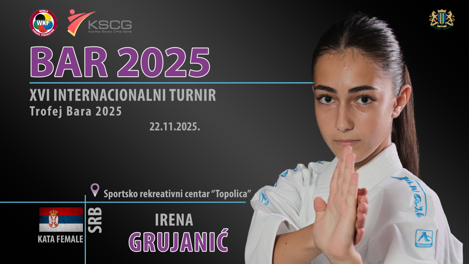 Irena GRUJANIĆ je osvojila prvo mesto u konkurenciji kadetkinja na XVI internacionalnom turniru TROFEJ BARA 2025 koji je danas održan u Sportsko rekreativnom centru “Topolica”. Irena je do prvog mesta stigla posle četiri ubedljive pobede. U prvom kolu je bila slobodna, dok je u drugom kolu pobedila Višnju Bulatović iz KK “Panter”, Podgorica. Pobedu je zabeležila i u četvrtfinalu gde se sastala sa Lanom Selimotić iz Karate regije Hercegovine. U polufanalu je zabeležila pobedu protiv domaće takmičarke Nađe Knežević iz KK “Bar”, dok se u finalu sastala sa Teodorom Medojević iz KK “Mladost”, Podgorica i zabeležila sigurnu pobedu. Sigurnim nastupom na ovom turniru Irena je pokazala da se nalazi u odličnoj formi i da je spremna za nastup na Svetskom kupu mladih koji će se održati u Veneciji od 4. do 7. decembra 2025. IRENA ČESTITAMO!