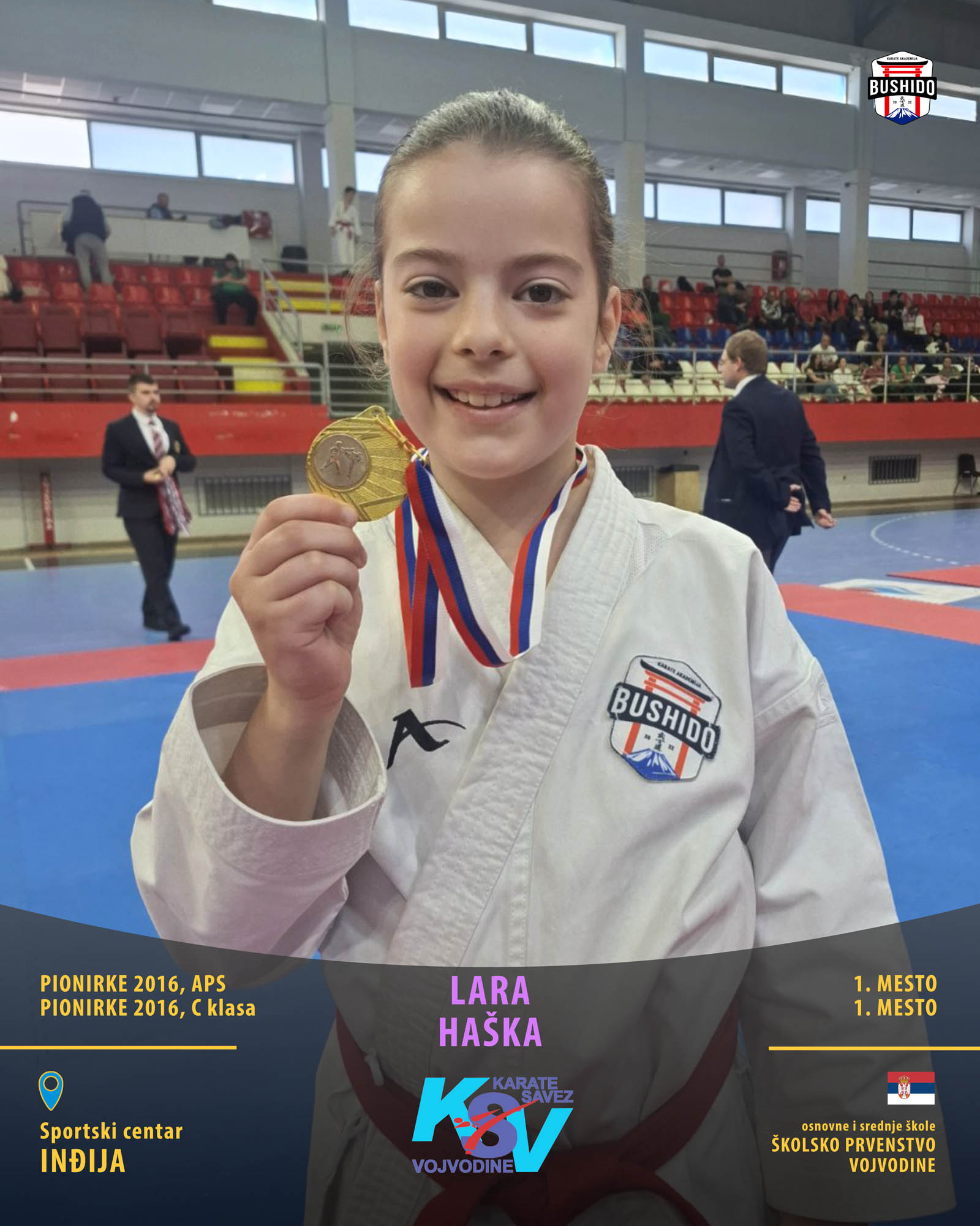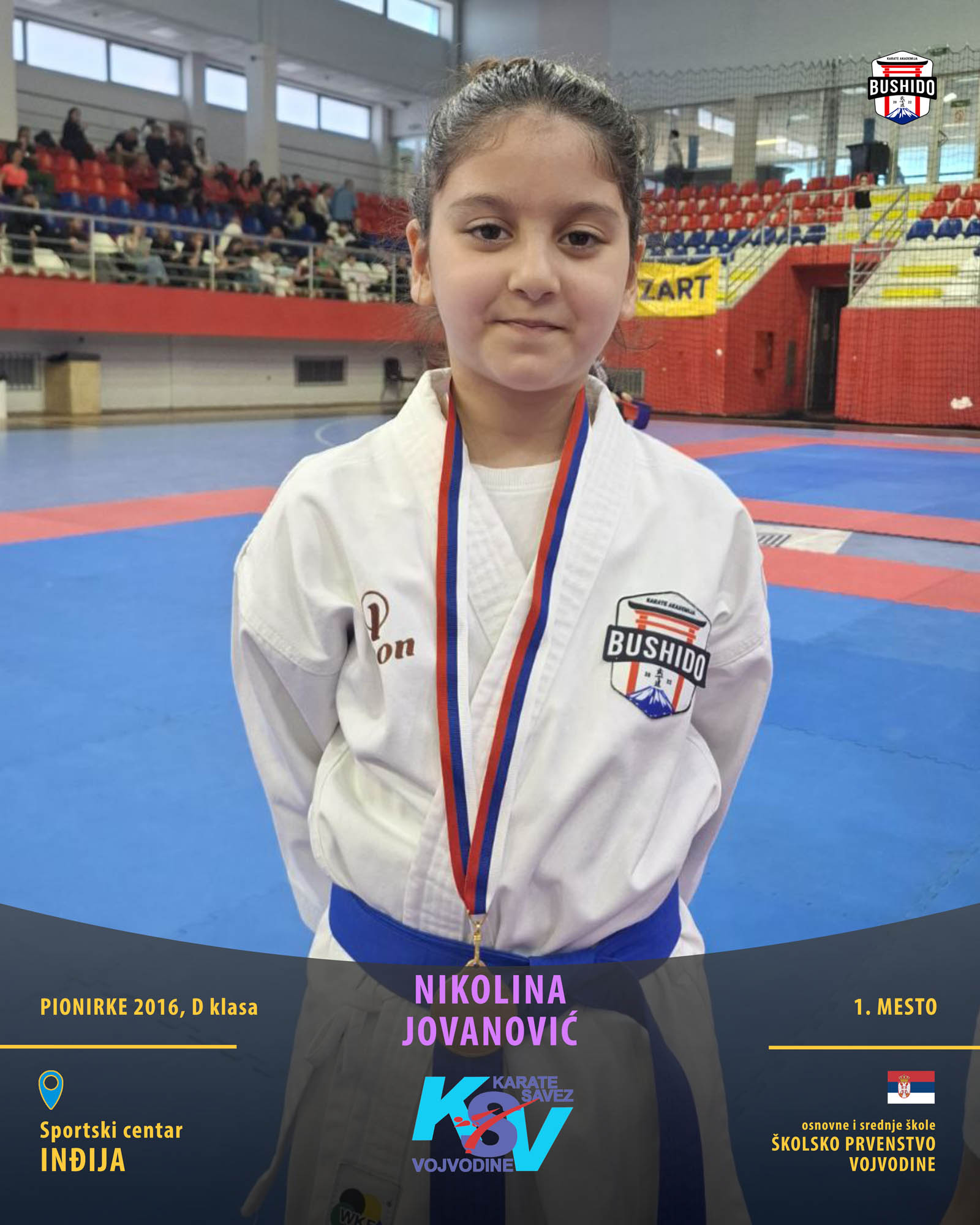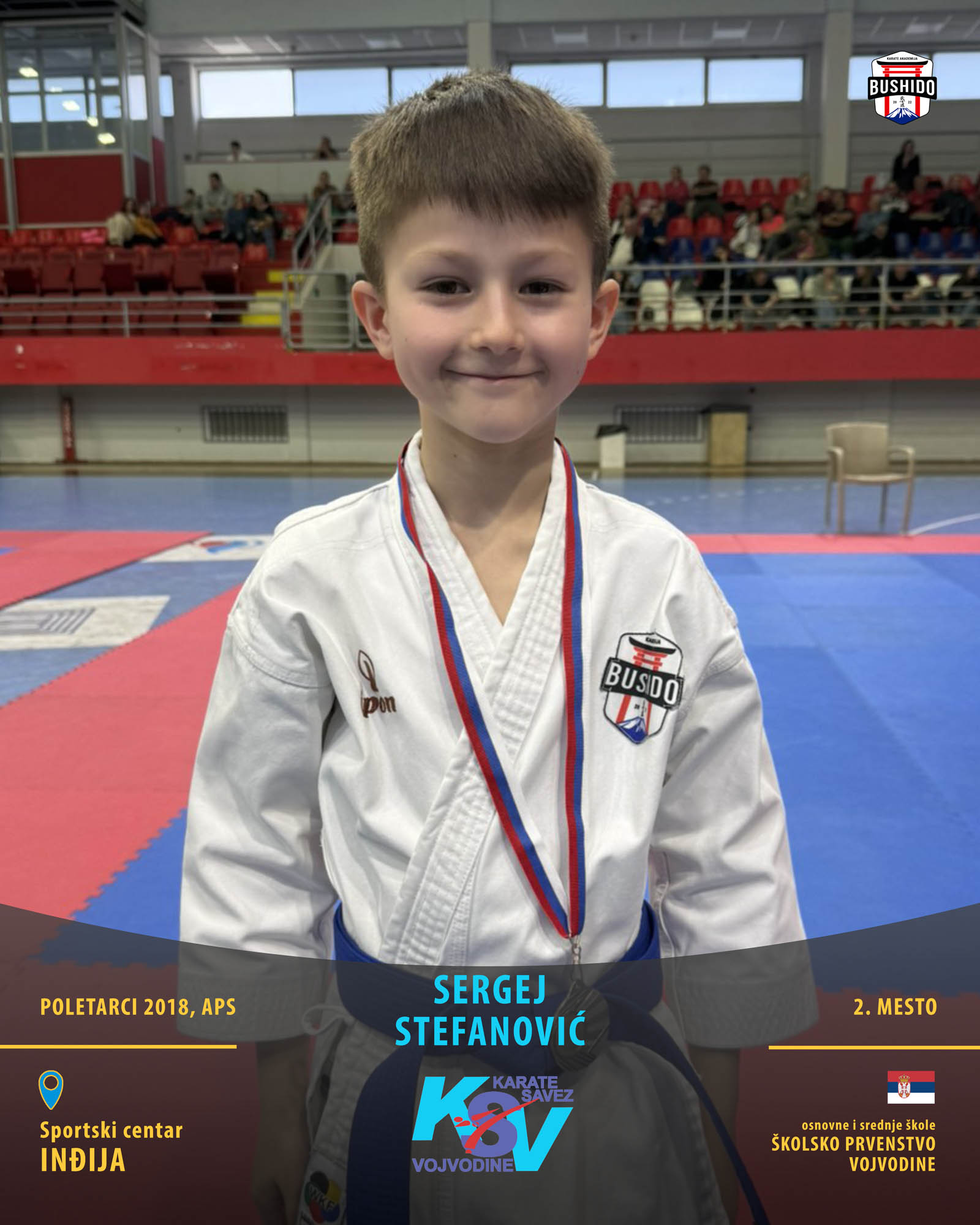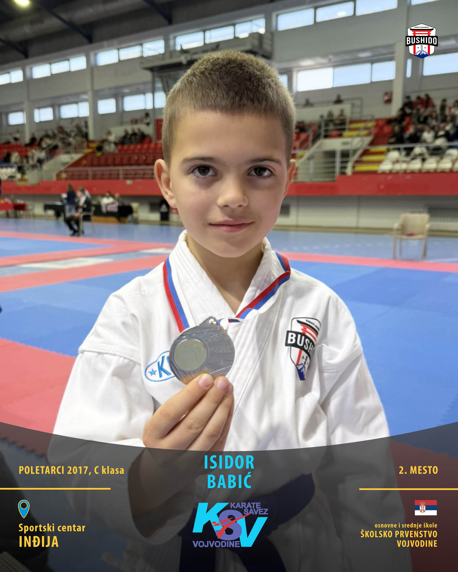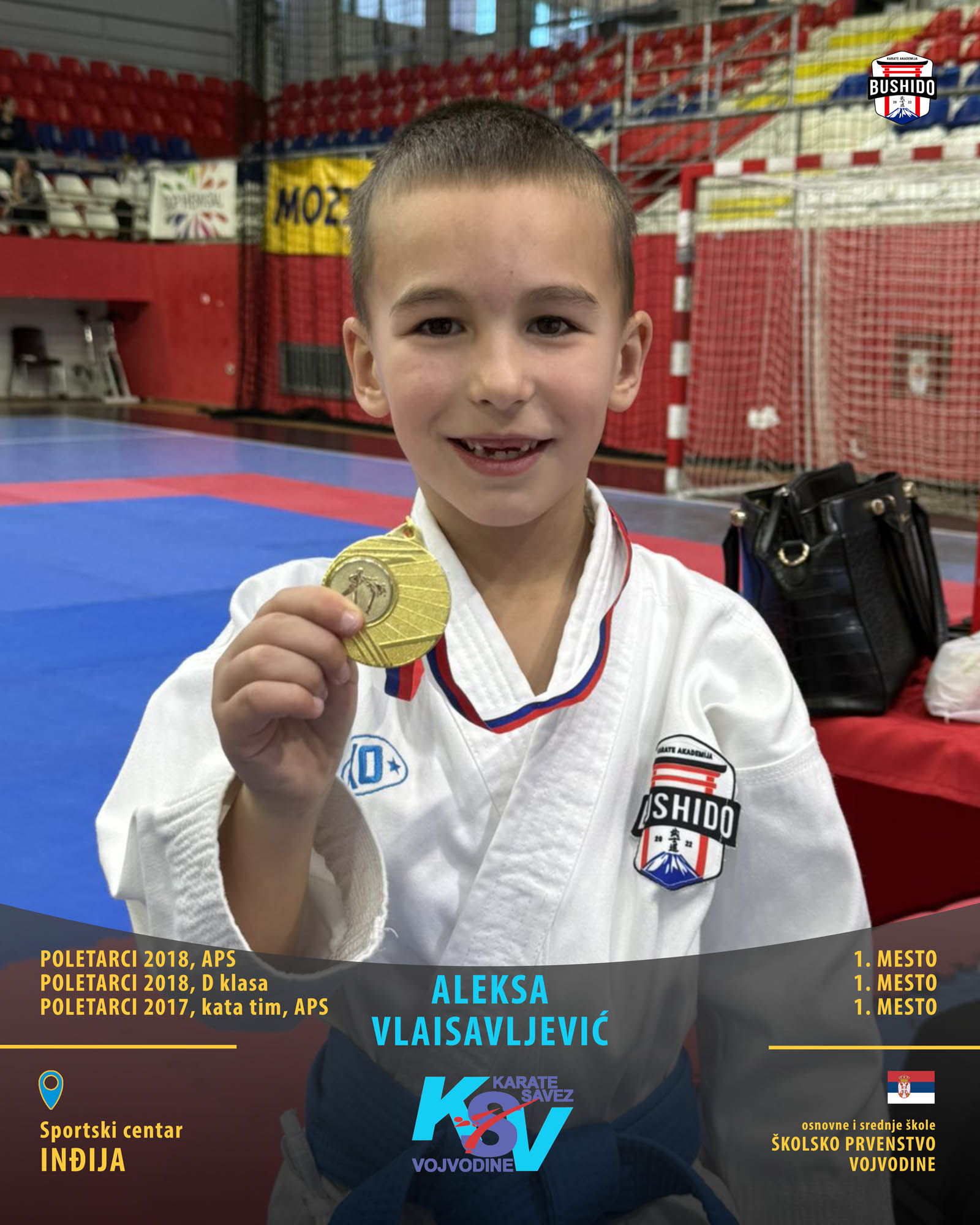 U Novom Sadu je u nedelju, 8. marta 2026. godine održano Prvenstvo Vojvodine za poletarce, pionire i nade u organizaciji Karate saveza Vojvodine. Nastupilo je ukupno 43 karate kluba iz Vojvodine, a naši najmlađi takmičari su imali sjajan nastup osvojivši čak 24 medalje od čega 12 zlatnih, 6 srebrnih i 6 bronzanih zauzevši na taj način ukupno drugo mesto na listi najbolji klubova Vojvodine. Pravi podvig napravili su Stefan BALANGO i Aleksa VLAISAVLJEVIĆ koji su uspeli da osvoje čak tri zlatne medalje. Nastupili su zajedno u kata timu, a zatim su osvojili zlatne medalje i u pojedinačnoj konkurenciji u svojim godištima u apsolutnoj kategoriji i u klasama. Osvajači medalja na ovom prvenstvu ostvarili su plasman na državno prvenstvo.