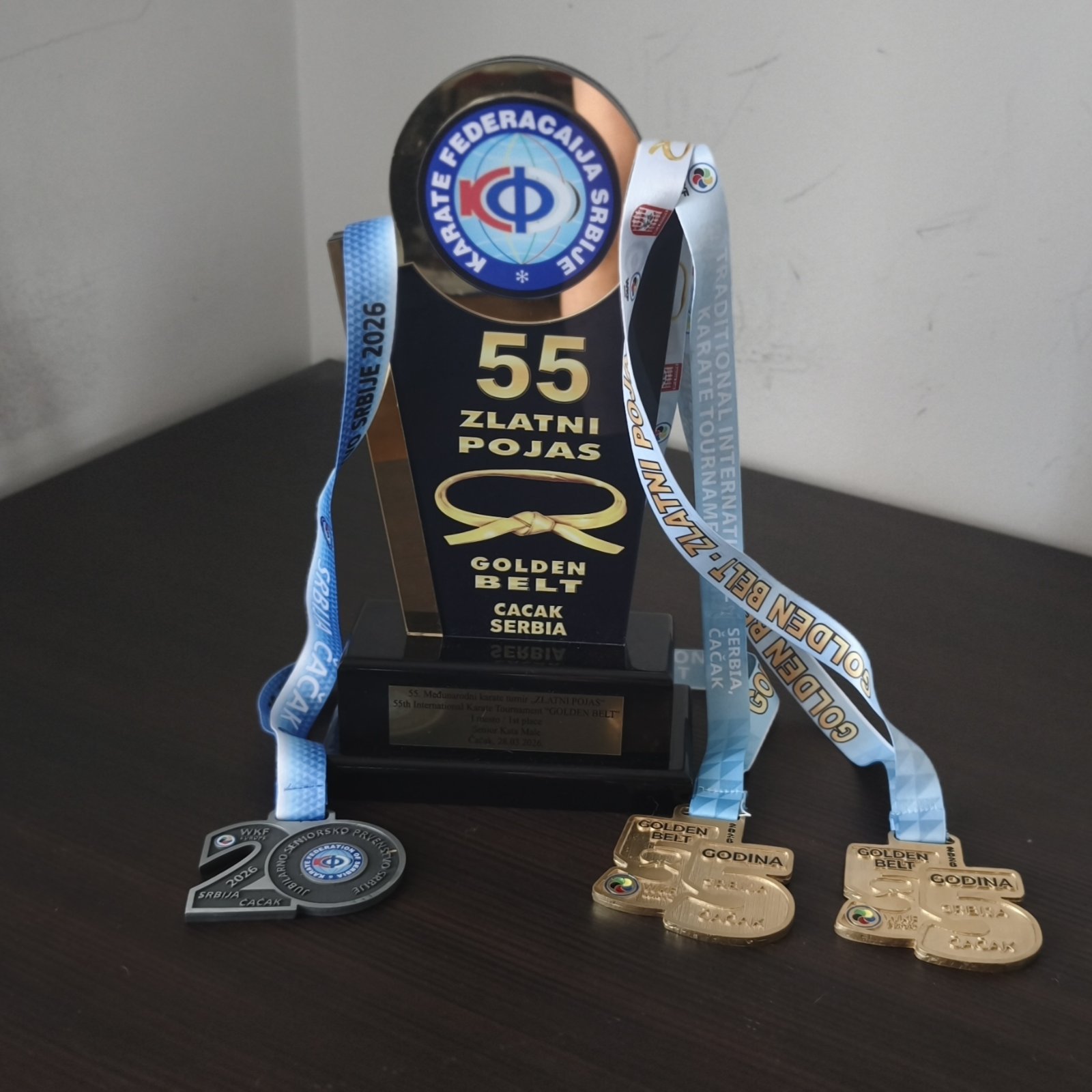 Prvu medalju osvojio je Aleksandar Boškov kojem je za dlaku izmakla titula šampiona Srbije. U prvom kolu Boškov je bio slobodan da bi u osminifinala bio ubedljiv protiv Uroša Milašinovića iz KK Kinder, Beograd. U četvrtfinalu sreo se sa Sašom Đurićem iz KK Radnički Kovin i bez problema se plasirao u polufinale. Polufinalni meč doneo je uzbudljiv meč sa Vasilijem Jakovljevićem iz KK Skipper, Beograd. Iako su oba protivnika bila odlična sudije su presudile da će Boškov u finale. U finalu ga je čekao naš najiskusniji takmičar Andrija Stanković iz KK Elid, Niš. Meč dostojan finala u kojem su se sastala dva naša trenutno najbolja kataša. I ovde su odlučivale nijanse i na kraju su sudije presudile 2:1 u korist Stankovića. Boškov je zauzeo drugo mesto i to mu je četvrta u nizu medalja sa seniorskog prvenstva Srbije. do sada ima dve bronze i dva srebra. Time je završen nestvaran vikend za Boškova. Na Zlatnom pojasu Čačka i na Seniorskom prvenstvu Srbije u samo dva dana Boškov je radio vrhunsko izvođenje čak 12 kata. To se davno nije dogodilo. Izuzetan fizički napor. Ipak, pokazao je da je u ovom trenutku jedan od najspremnijih takmičara koje ima Srbija. Dva zlata sa najstarijeg turnira u Evropi (Zlatni pojas Čačka) i srebro sa seniorskog prvenstva Srbije stigli su kao prelep poklon za 20. rođendan koji je Aleksandar proslavio samo dan pre ovih takmičenja. Sada sledi period kratkog oporavka pred tempiranje forme za naredna međunarodna takmičenja od kojih je prvo Svetska liga Karate 1 Series A u La Korunji u Španiji.